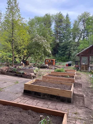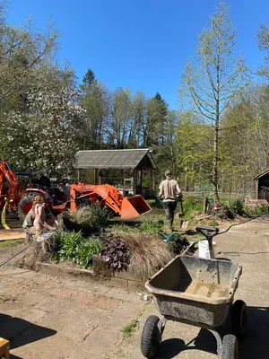 Lucky for us, April didn’t bring too many showers, which meant we could make some serious progress outdoors. We reinforced the hillside behind the barn - where we felled trees back in November - took down an old rotten duck pen, and demoed the old, crumbling concrete beneath the pergola. Next we lowered and leveled the area, and graveled it to become a future ceremony site.
