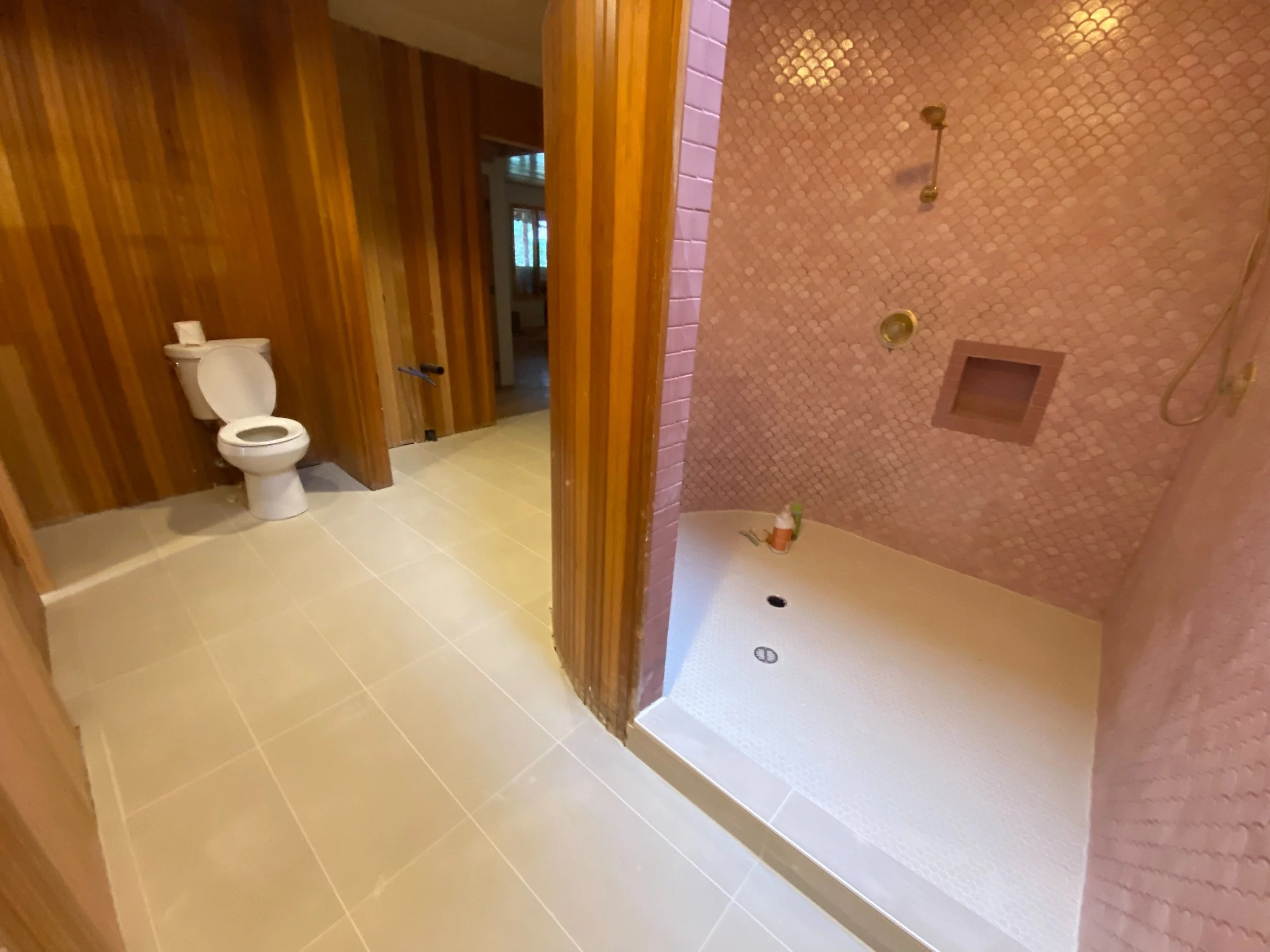 The breakneck pace of progress carried right into the New Year, with new hardwood floors going in upstairs, framing for the reimagined downstairs bathroom taking shape, and tile finally going up in the gorgeous new upstairs shower — I’m so glad we decided to add that skylight! It completely transforms the space.
